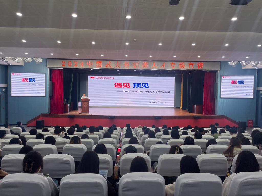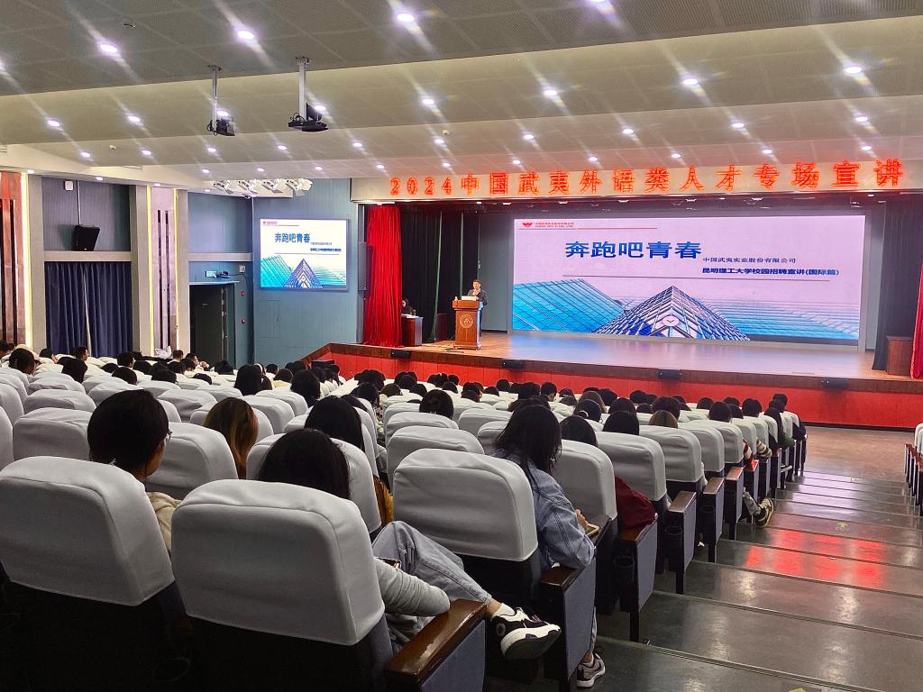 邀请中国武夷实业股份有限公司(以下简称“中国武夷”)在公教楼小剧场开展海外就业经验分享会暨专场宣讲会。院党委副书记邱清遐,本科生及研究生就业指导教师,外语类本科生、研究生,以及来自其他学院的应届毕业生共计约两百人到场参加活动。
