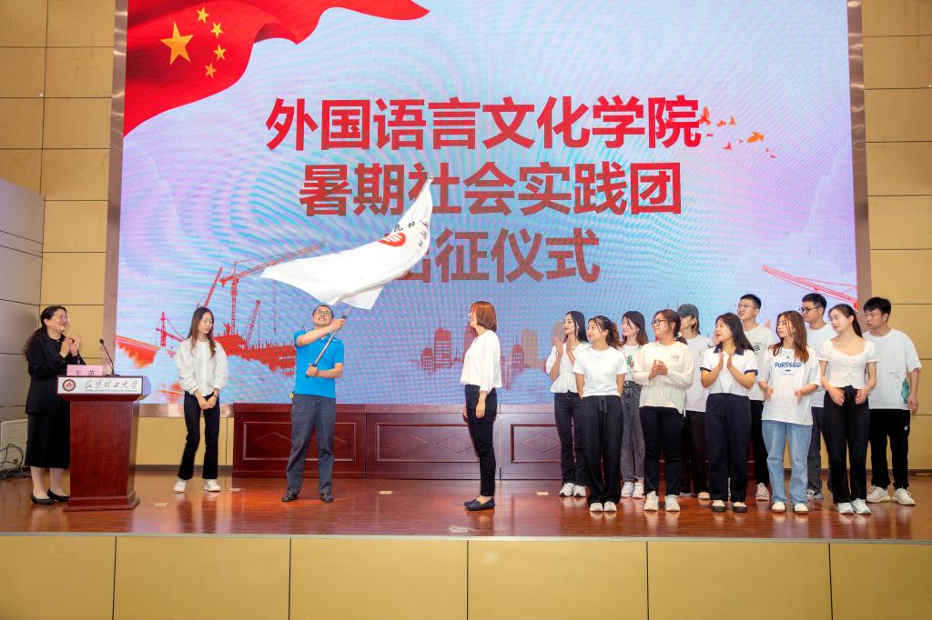 院长王英、党委书记刘建平、党委副书记邱清遐以及暑期社会实践团成员出席会议。刘建平书记为暑期社会实践团队授旗。