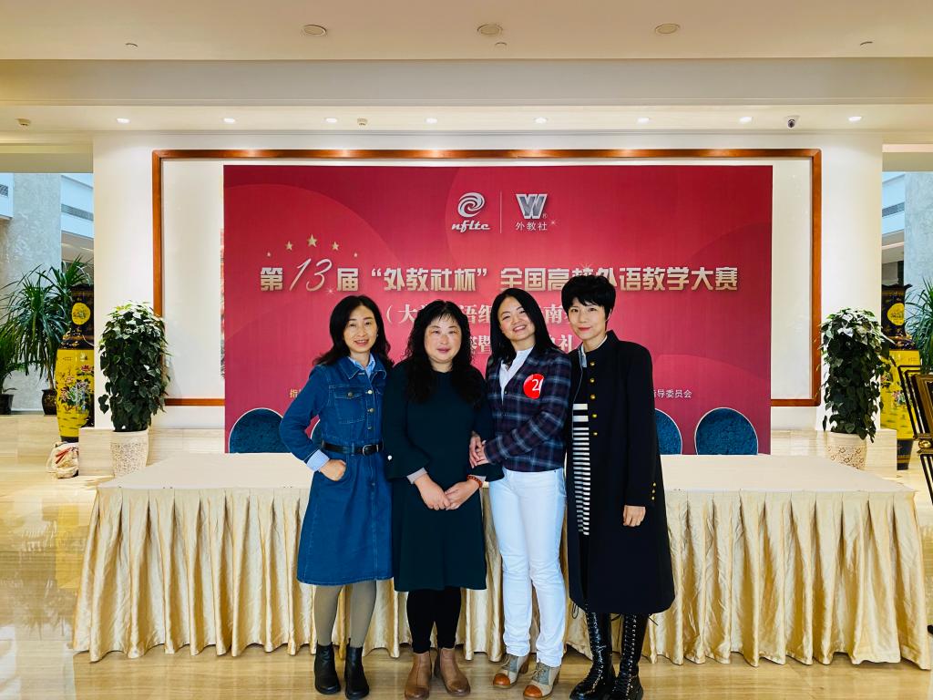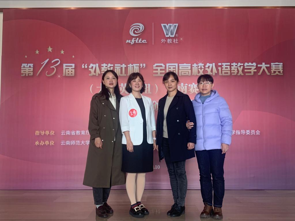王凤玲、周艳青、阮淑俊、陈春丽组成的综合课组和闫峰、杨玲、严嘉、王瑞组成的听说课组在此项赛事中喜获佳绩。综合课组和视听说组领队王凤玲和闫峰分别获得授课比赛云南赛区二等奖,其带领的团队也分别获云南赛区团队二等奖。