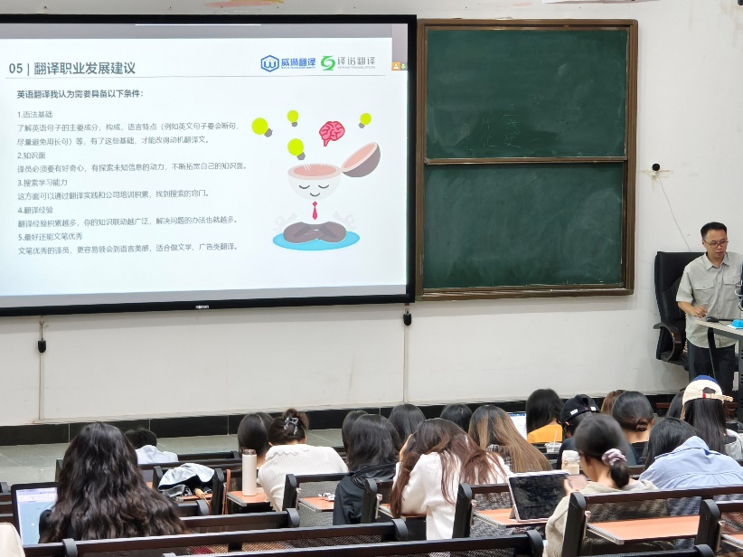 邀请南宁威琳如译翻译有限公司高级翻译/英语翻译部培训主任钟嘉庆开展题为“AI时代下翻译行业的未来与个人职业发展——从业十年经验交流”的讲座。讲座在博文100报告厅进行,由李泽生副院长主持,威琳如译翻译有限公司领导、本科生、研究生共计150余人参加。