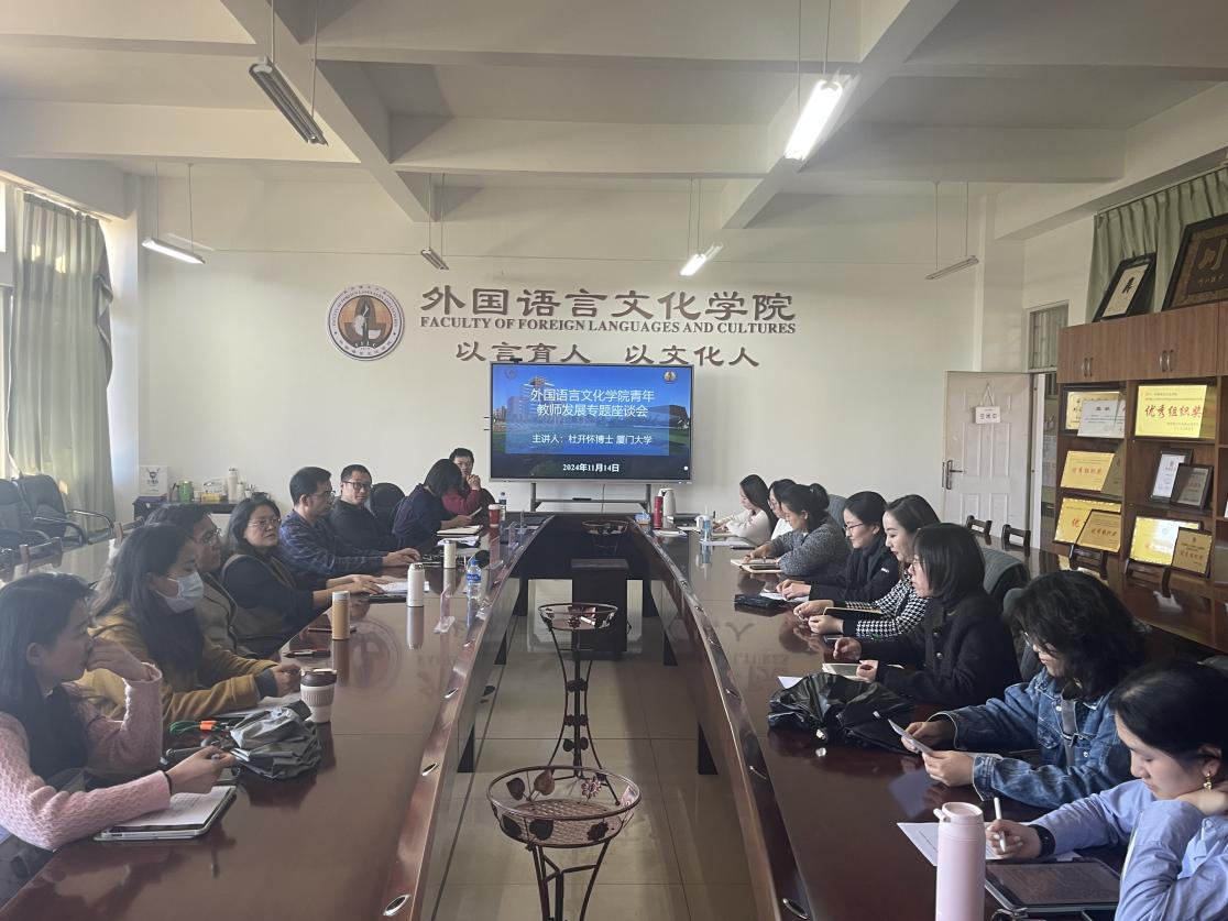 首先,学院各位新进青年教师代表就个人教学、科研与管理工作等情况进行自我介绍。其次,杜开怀就自身职业发展规划与经历、高校英语教学发展理念与路径、教学中的学生需求与回应等方面进行发言并与新进教师代表展开交流。杜开怀指出,科研工作应具有对接国家战略需求的眼光,建议学院教师利用学校区位优势和发展重点,开展特色英语教学新方式,并就教师如何平衡教学、科研与管理工作这一问题提出了切身的经验建议。马倩从时间管理、专业能力与特长发展、教学素材积累助力科研等方面对青年教师发展提出建议。