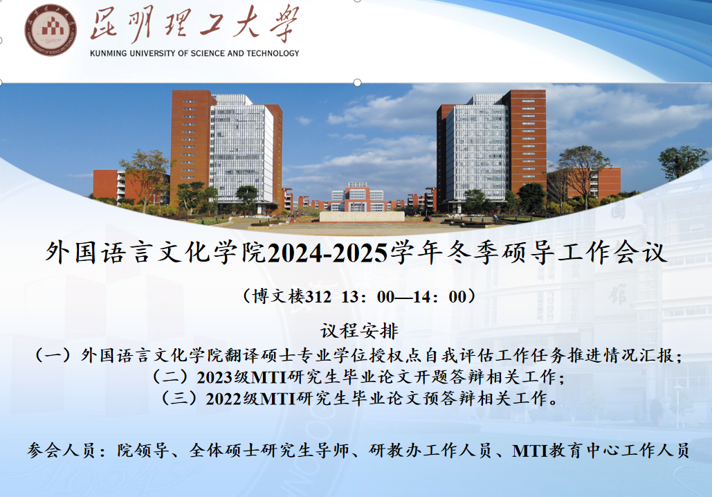 在博文楼312召开2024-2025学年上学期学期末硕导工作会议,总结翻译硕士专业学位授权点自我评估工作,安排2023级研究生毕业论文开题及2022级研究生毕业论文预答辩工作。王英院长、李泽生副院长、马倩副院长、学院全体硕导,MTI教育中心和研教办工作人员参加了会议。会议由李泽生副院长主持。