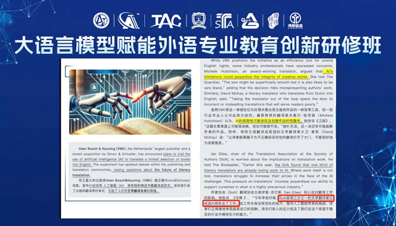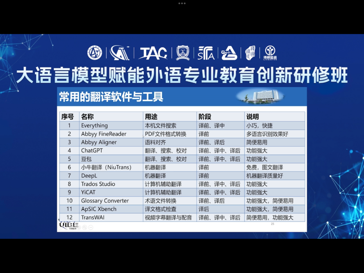 组织39位教师代表参加了“2025年暑假大语言模型赋能外语专业教育创新研修班”(线上)学习交流。研修班由中国外文局翻译院智能翻译实验室、中国翻译协会翻译技术专业委员会、长安大学外国语学院以及国内多家知名语言服务企业共同举办。研修内容聚焦“技术赋能、人文守正”主题,聚焦大语言模型赋能外语专业教育发展、翻译实践、教学设计、科研实践等专题模块,共话大模型时代政产学研协同创新翻译教育新图景,通过专家理论精讲、行业场景实训、高校案例分享以及圆桌沙龙讨论等多元形式,着力提升外语教师AI技术应用能力与数字人文素养。