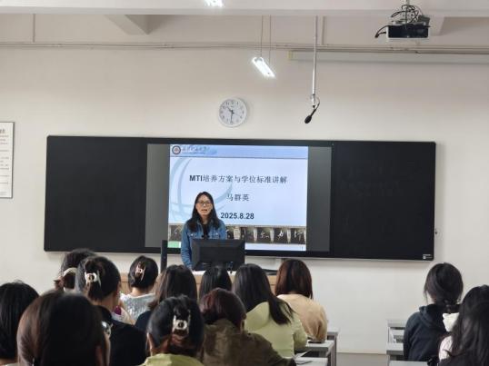 在博文楼403举行了2025级研究生新生入学教育。MTI教育中心主任马群英博士、学科科研办兼外国语言文学研究所主任高维博士结合研究生培养方案对研究生未来的学习进行了指导,两位2023级研究生同学进行了学习经验分享。