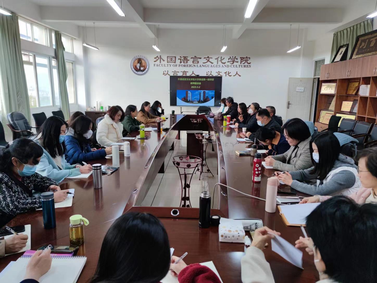 于2023年3月2日分别组织召开了大学英语第一教研部、大学英语第二教研部、英语系、研究生公共英语教研部、欧亚语种教学部五个座谈会。学院刘建平书记、王英院长、李泽生副院长分别主持五场座谈会,全院一百余位教师参会。