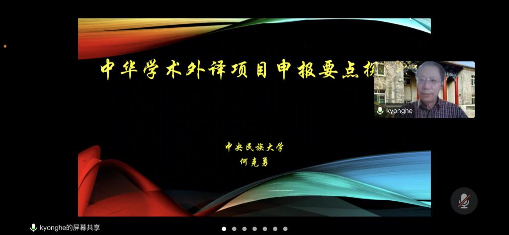 举办国家社科基金中华学术外译项目申报讲座,中央民族大学何克勇教授作题为“中华学术外译项目申报要点探讨”的专题辅导讲座,中文av