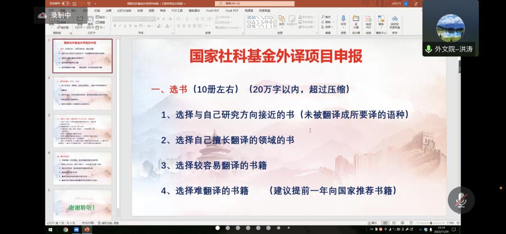 洪涛副教授分享了中华学术外译项目申报注意事项。讲座由人文社科研究院发起、中文av