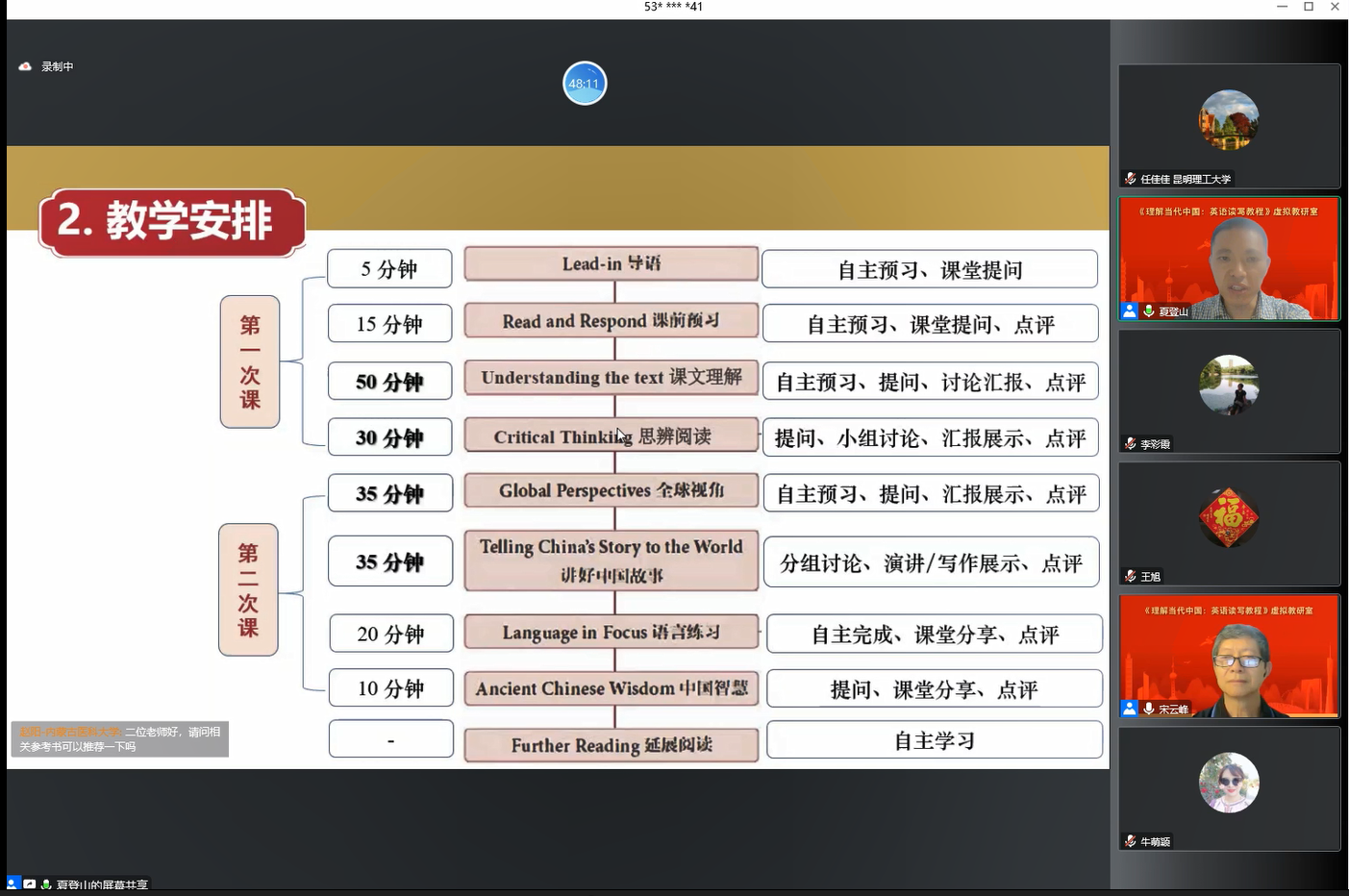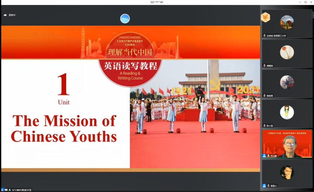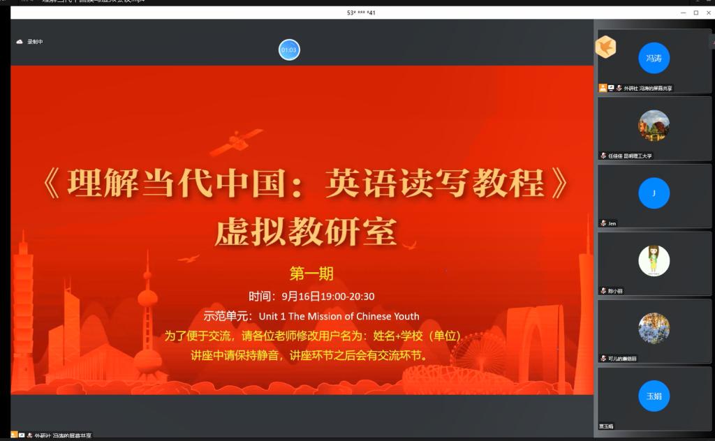 《理解当代中国高级英语读写》课程团队集体参加了外研社组织的第一期虚拟教研室活动。在观摩学习了教材编者团队的示范课和对教材编写理念的讲解后,课程团队对教材教学方法等进行了在线交流,并对开展集体备课、教学案例库建设等进行了深入研讨。