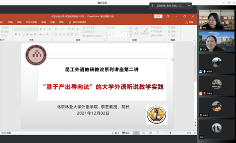 特邀北京林业大学外语学院院长李芝教授作了一场主题为“基于产出导向法的大学外语听说教学实践”的线上学术讲座,我院院长王英教授主持,共80余名教师一同聆听了讲座。