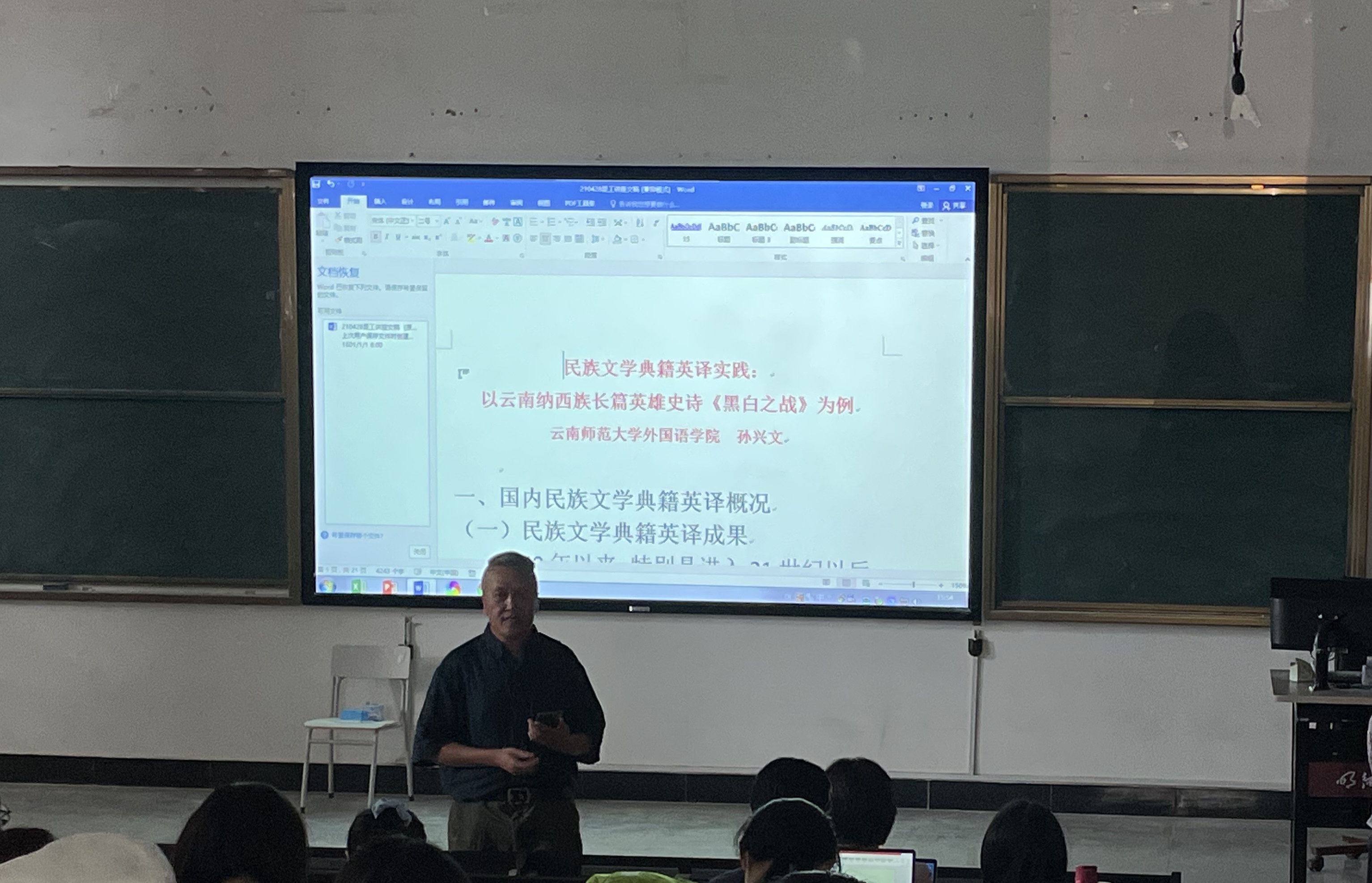 16点,活动正式开始。首先,主持人向大家介绍孙文兴教授。接下来,孙教授向大家介绍国内民族文学典籍英译汉概况以及相应的民族文学典籍英译成果,并以云南纳西族长篇英雄《黑白之战》为例为大家详细讲解民族文学典籍的英译实践。最后,孙教授为同学们答疑解惑。