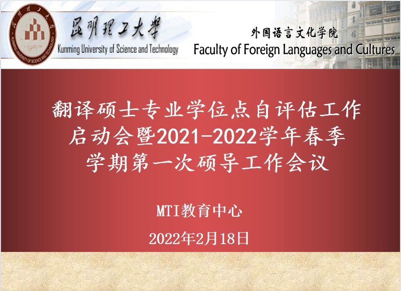 翻译硕士专业学位点自评估工作启动会暨2021-2022学年春季学期第一次硕导工作会议于2022年2月18日通过腾讯会议召开。会议主要议程为根据学校学位评估要求制定我院硕士点自评方案及落实评估责任,同时学习新时代高校教师教育职业行为10项准则。