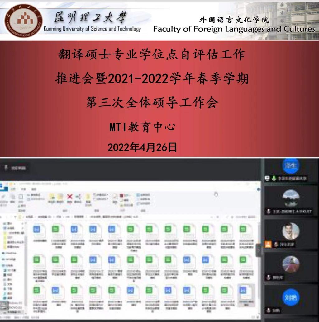 通过腾讯会议召开翻译硕士专业学位点自评估工作推进会暨第三次硕导工作会,通报硕士学位点自评估工作进展,部署后半学期MTI教育中心相关工作。