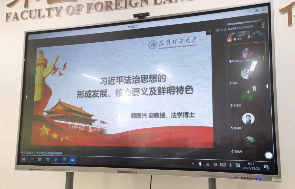 会议邀请学校法学院周国兴副教授作专题辅导,周副教授从习近平法治思想形成和发展的时代背景、核心要义、鲜明特色等三个方面系统介绍了习近平法治思想,并结合党的二十大报告中“坚持依法治国,推进法治中国建设”部分详细阐释了二十大精神。