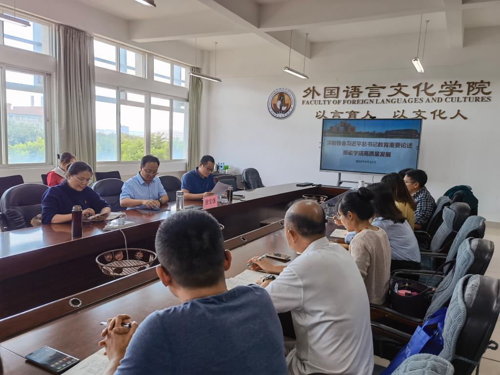 李泽生副院长、杨玲副院长做了重点发言。李泽生副院长分析了外国语言文学学科所处的现状和地位,对学院的科研团队建设、人才引进、师资队伍建设等交流了发展思路。杨玲副院长围绕习近平总书记关于教育的重要论述,结合学院“十四五”发展规划,交流大学外语建设的发展思路。