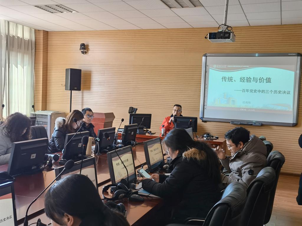 学校马克思主义学院任利伟副教授作了专题辅导。任老师以“传统、经验与价值——百年党史中的三个历史决议”为题,对党的历史上的三个历史决议做了分析阐述,重点讲述了十九届六中全会审议通过的《中共中央关于党的百年奋斗重大成就和历史经验的决议》,让学院干部更加深刻理解了《决议》的历史地位,更能准确把握“两个确立”的决定性意义,从而更加坚定地践行初心使命。