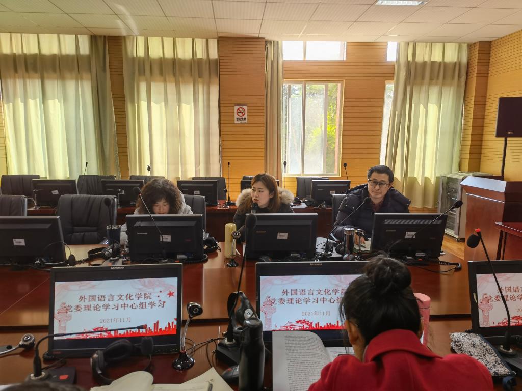 2021年11月25日下午,中文av 中文av 党委理论学习中心组举行2021年第八次集中学习,专题学习党的十九届六中全会精神。学院党委书记刘建平主持会议,学院领导、纪委委员、各系部(中心、室)负责人、各支部书记参加学习。