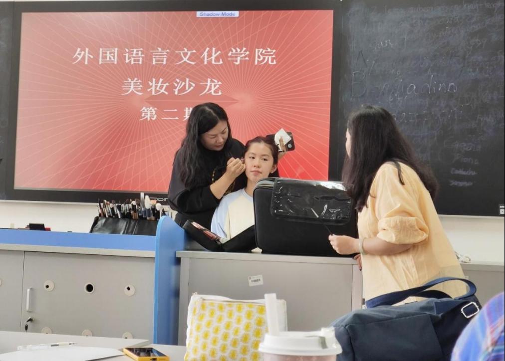 在活动过程中,安娅老师详细讲解并示范了如何上粉底,如何画眼线等化妆流程,带领大家一边操作一边学习。经过美妆老师的专业讲解和她对模特的化妆过程展示,师生们收获了很多关于化妆的知识。师生们对化妆技巧表现出了浓厚的兴趣,相互交流心得,在愉悦开心的氛围中增进了彼此的情谊。