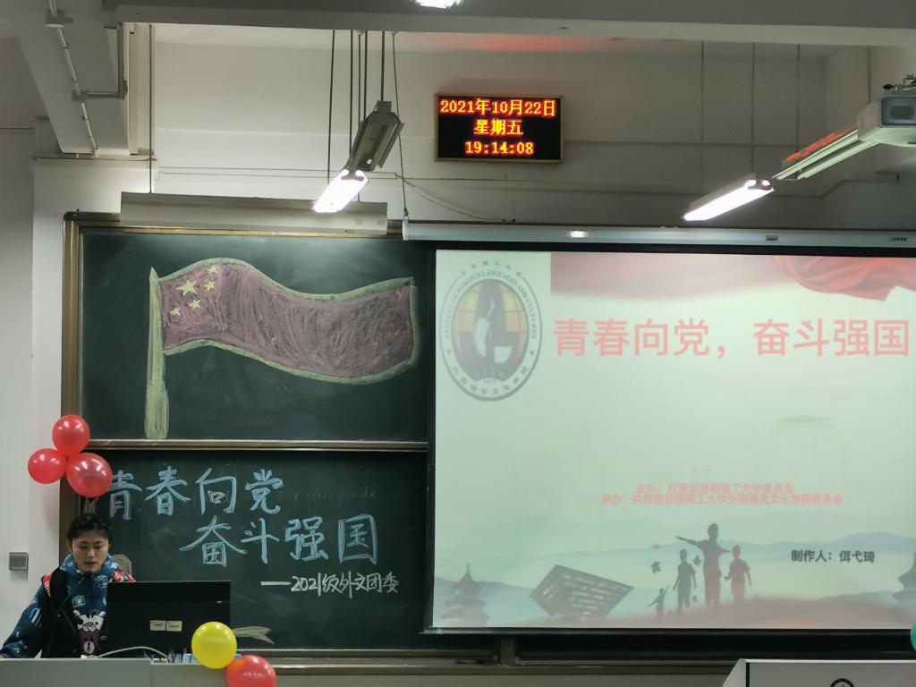 2021级在西北A教学楼202教室开展“青春向党,奋斗强国”主题团日活动。本次活动由2021级团支部组织,2021级杨梅婷同学主持,外文院2021级全体学生参加。
