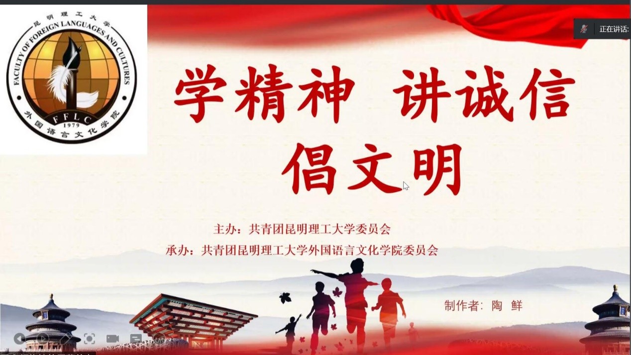 2022617日,中文av 2021级在线上开展“学精神 讲诚信 倡文明”主题团日活动。本次活动由2021级团支部组织,2021级杨梅婷同学主持,外文院2021级全体同学参加。