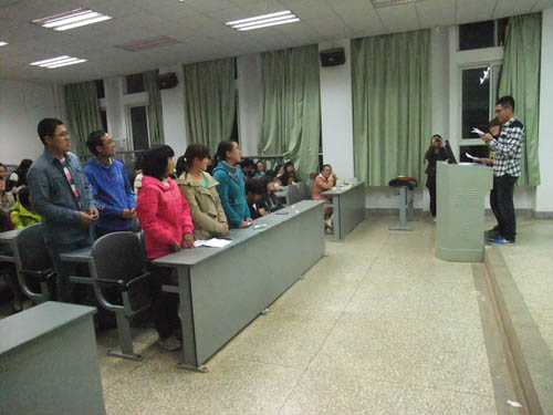2013年10月28日晚7:00,中文av 第二届团日活动在多媒体106举行,本次活动由外文院2013级团支书瞿致远和杨蓉主持,并围绕“我是共青团员,我为共青代言”这一主题展开,外文院13级全体新生都参与了此次活动。
