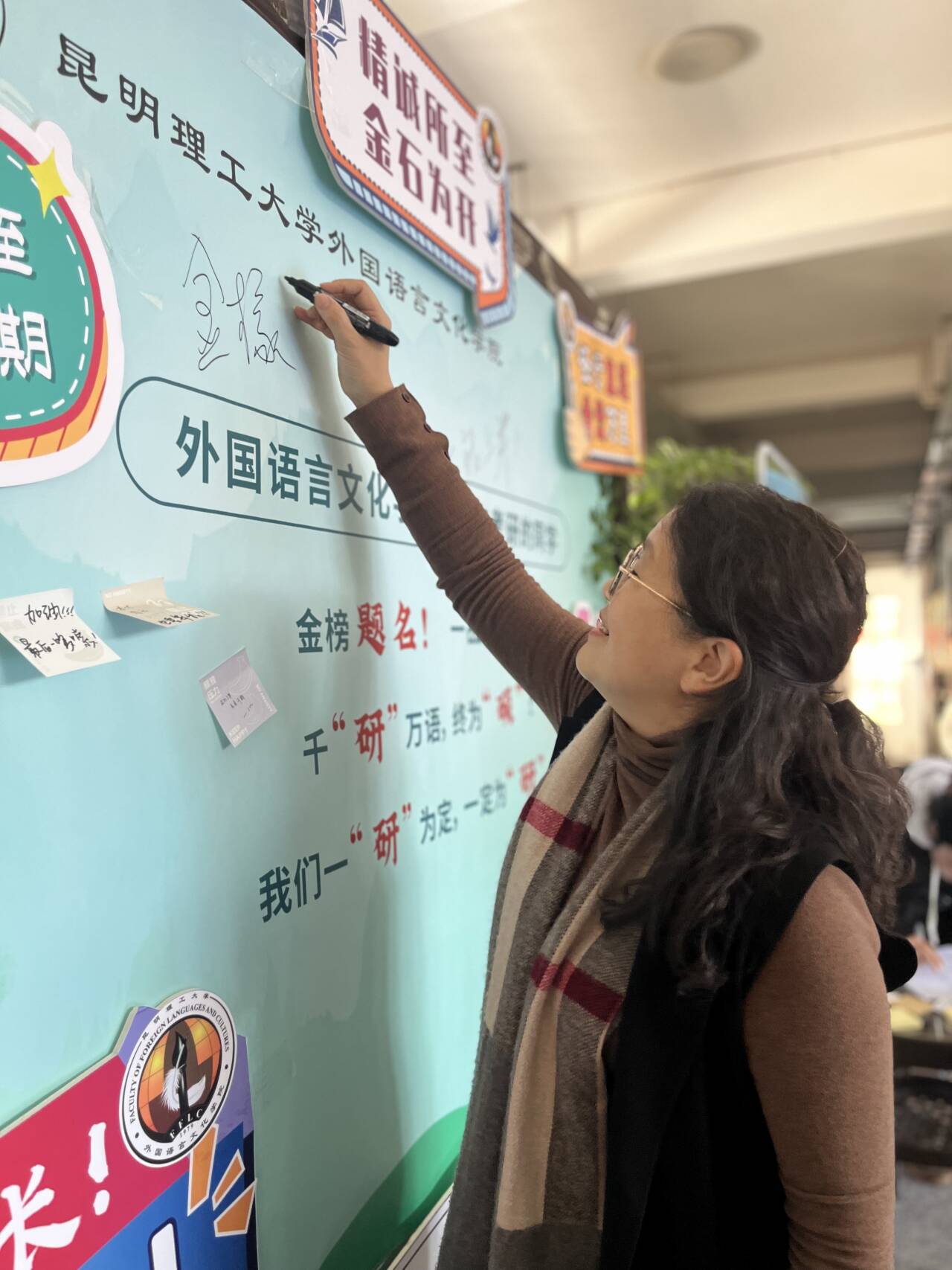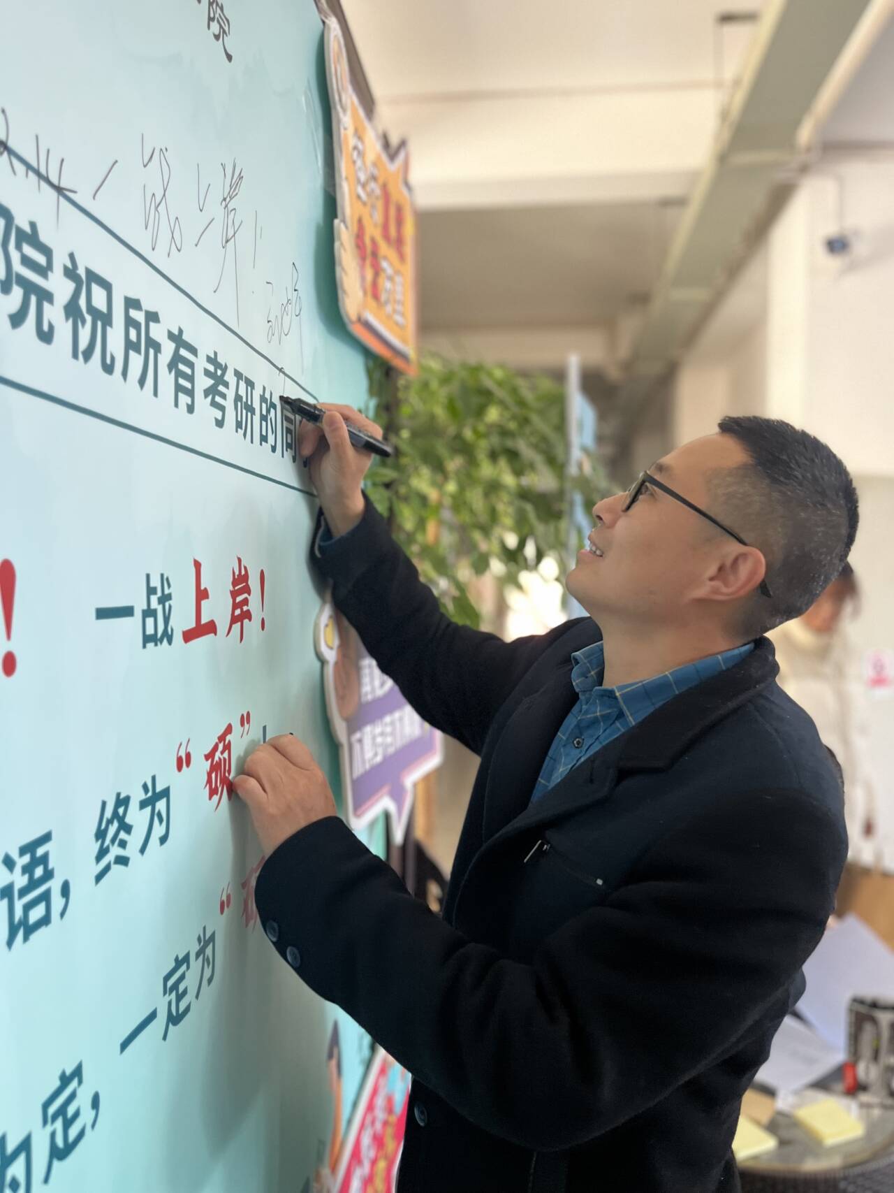 学院领导和老师与到场学生代表进行交流,亲切问询学生的备考情况,为考研学子送上慰问礼包。本次活动准备共计70余份慰问礼包,发放礼品包含考试文具、祝福书签等,为考研学子送去冬日的温暖祝福。博文楼一楼设考研加油站,学院师生将美好的祝福写在便利贴和宣传展板上,为考研学子加油打气。