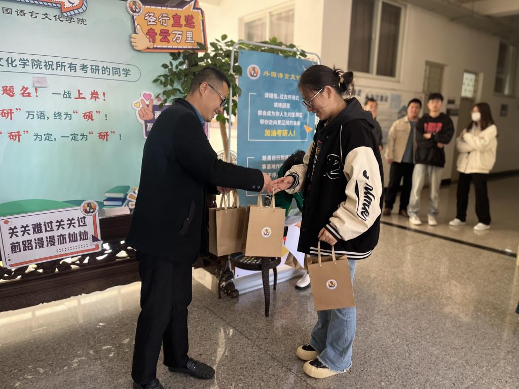在博文楼一楼大厅开展考研慰问活动。2024届毕业生代表、班主任、辅导员共计二十余人参加活动。学院党委书记刘建平、院长王英、副书记邱清遐、副院长马倩出席活动并为学生送上慰问礼包。