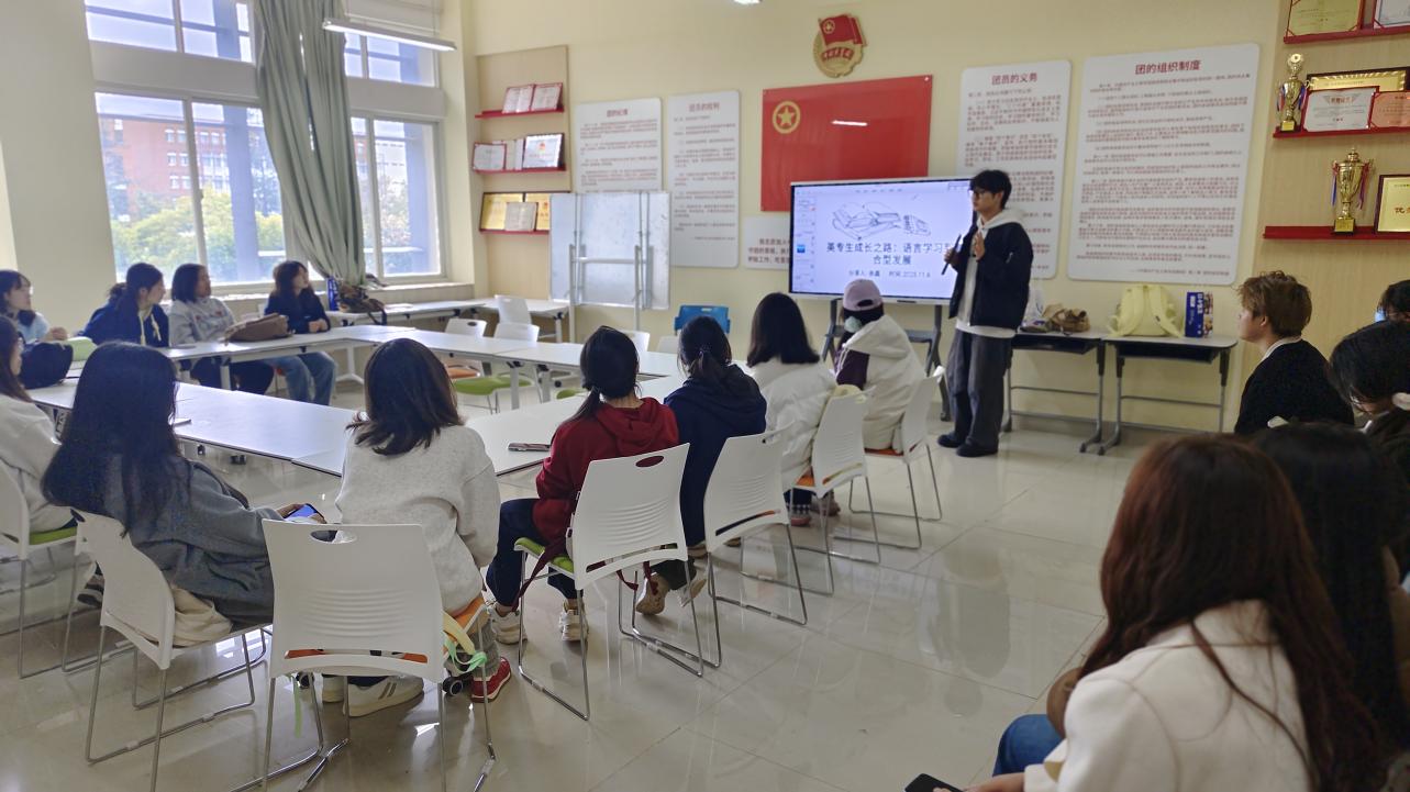 翻译社举办了英语学习经验分享活动。本次活动旨在帮助大一同学更好地适应大学英语学习节奏,掌握高效学习方法和未来职业生活规划。讲座邀请学院2022级余鑫同学进行分享,翻译社全体成员参加活动。