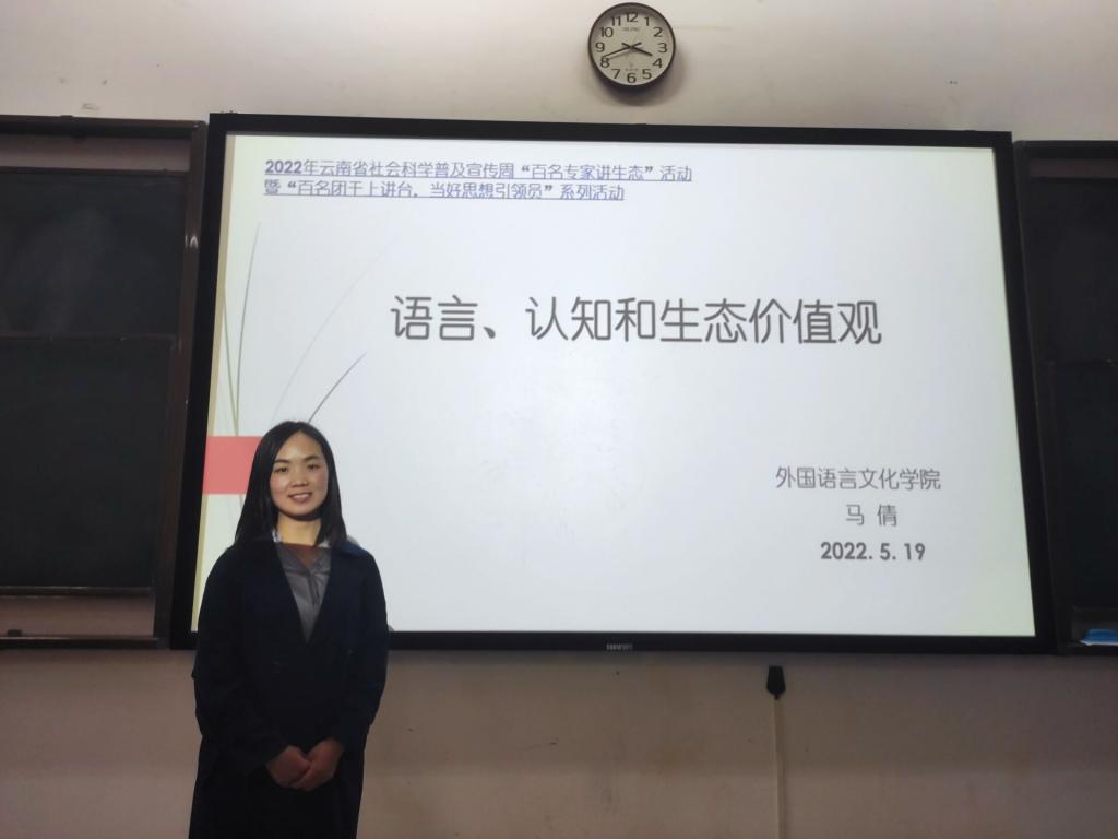 在多媒体100教室开展百名团干上讲台“语言、认知和生态价值观”系列讲座。本次讲座由外文院团委组织,马倩老师主讲,外文院2020级以及2021级全体同学参加。