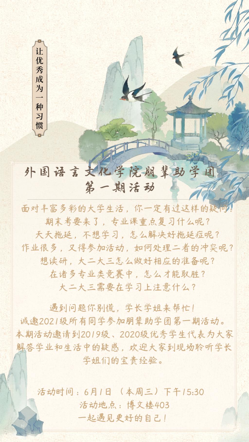 在总结学生工作既有经验的基础上,结合学生的实际需求,依托各本科生年级学习委员以及2019级、2020级成绩优异的学生成立朋辈助学团,旨在围绕英语和翻译专业的专业认知、专业学习、成才规划等开展工作。