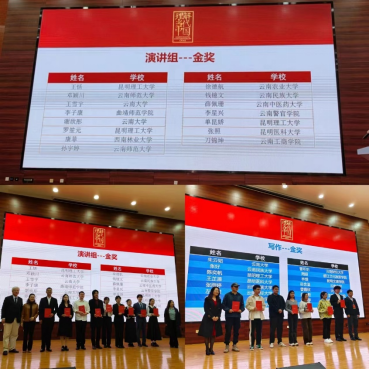 研究生徐静娴获得金奖;写作赛项中,法学院本科生陈奕帆、电力工程学院研究生牛犇获得金奖。各赛项金奖获奖选手将代表云南省参加12月份在北京举办的全国总决赛。