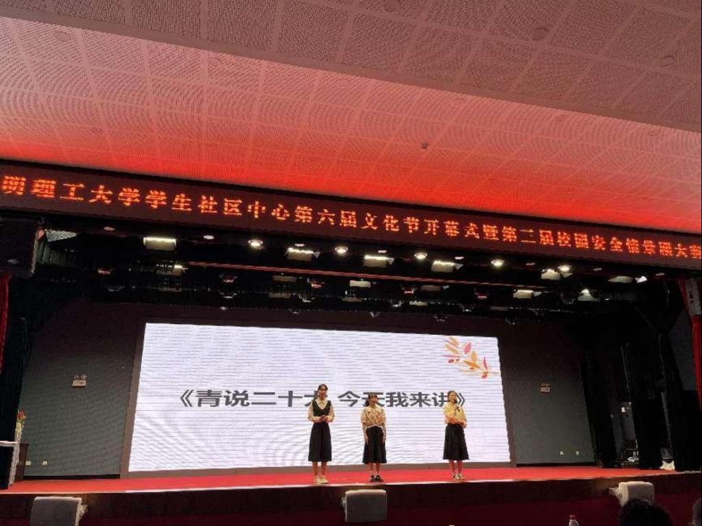 “清风”双语宣讲团成员杨梅婷、王立思、王明月受邀到学生社区中心第六届文化节开幕式上开展以《“青”说二十大,今天我来讲》为题的宣讲活动。宣讲团成员以同龄人视角,学习宣传党的二十大精神,旨在引领广大学生听党话、跟党走,担起新时代赋予的历史使命。