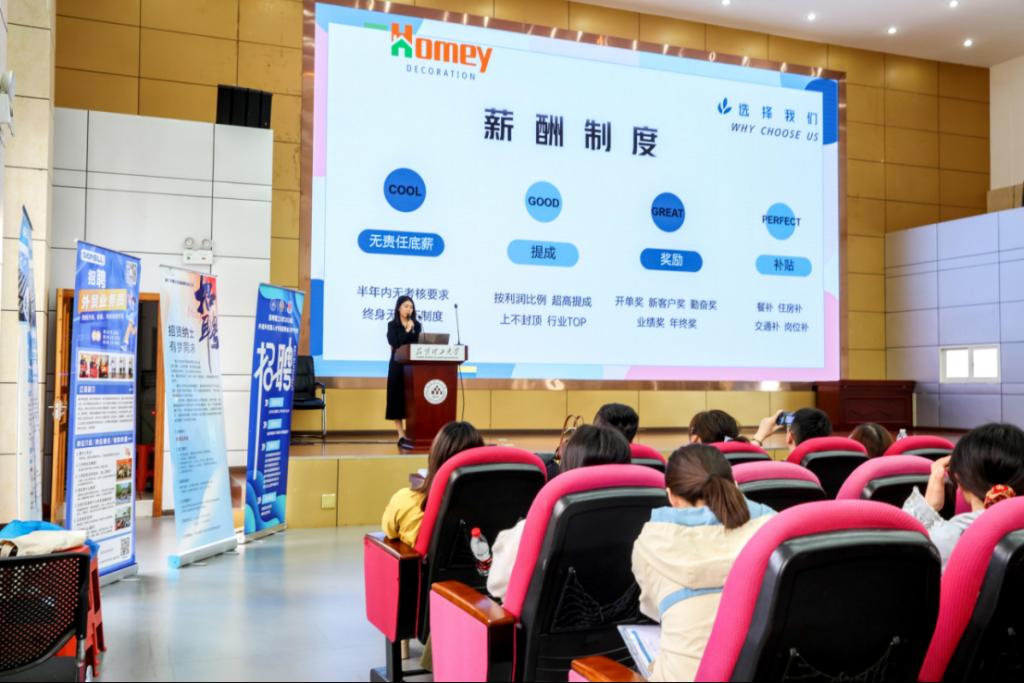 来自浙江合美装饰材料有限公司、桐乡市思诺特照明有限公司、海宁市凌锐贸易有限公司、海宁市明远装饰材料有限公司、海宁宏鹰装饰材料有限公司、海宁江森人造草坪有限公司、海宁耘睿进出口有限公司的7位企业负责人依次详细介绍了公司的主要业务和岗位需求情况,邀请学生参加企业面试。